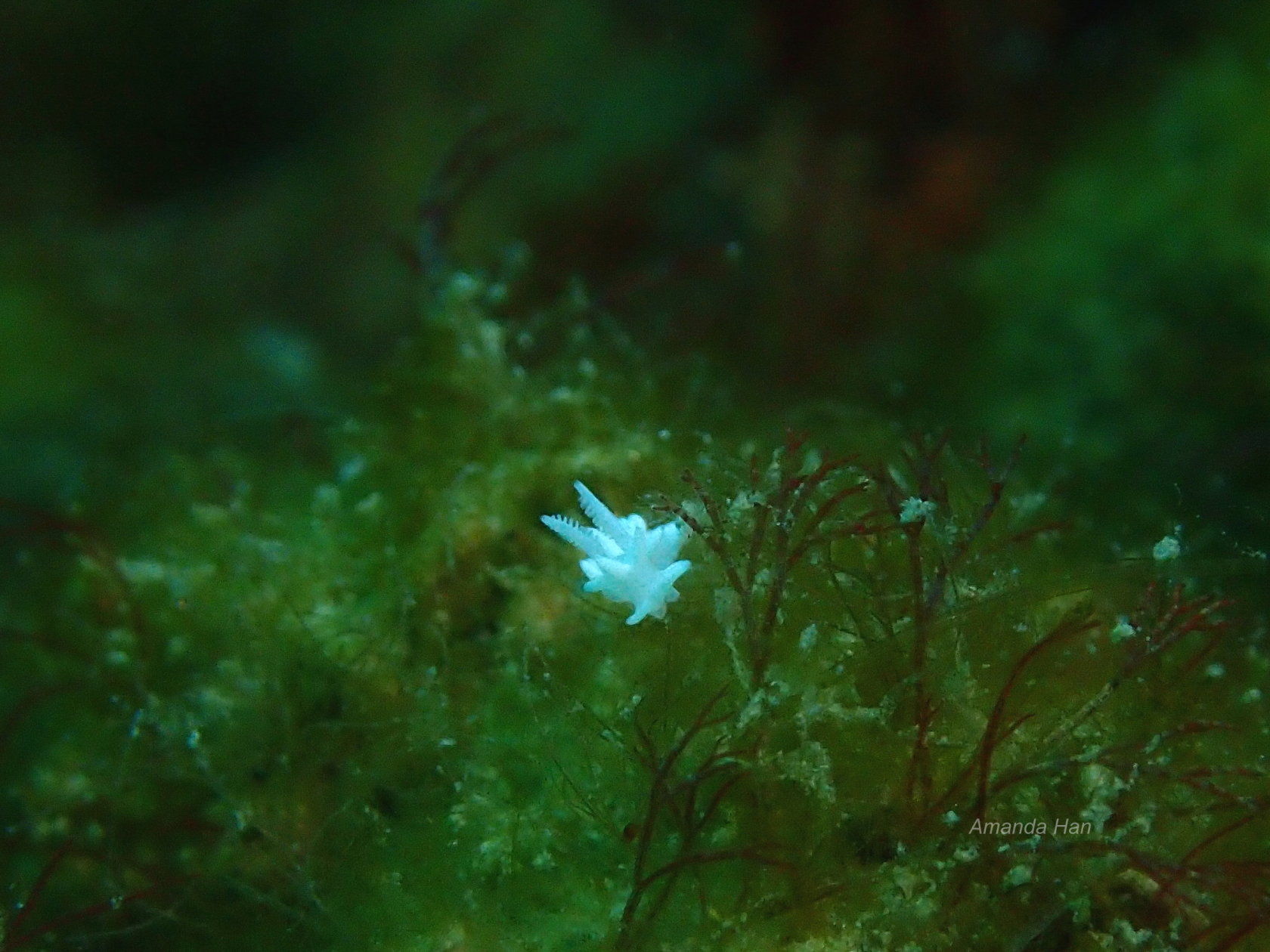 這隻白色超級微小生物是 日本隅海蛞蝓 (Okenia japonica ),身體呈半透明的白色,外套膜的周圍有很多棒狀突起,背部也有一個桿狀突起。由於白色身體上有很多一根一根的突起,所以就有了「魚骨頭」的外號。