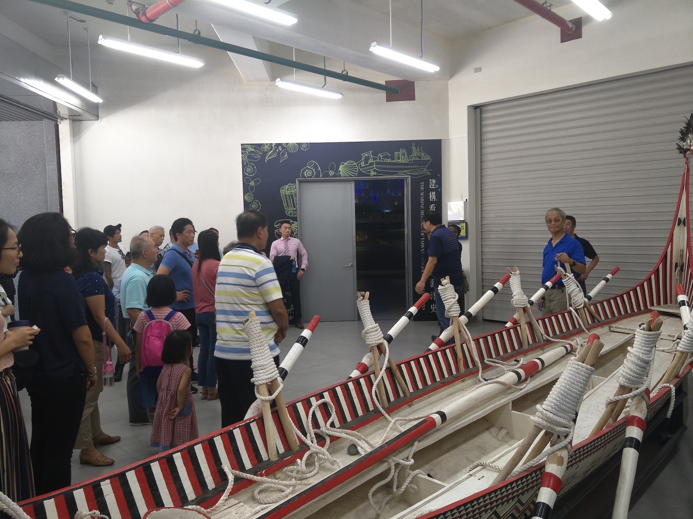 國立海洋科技博物館的研究典藏中心(開放式庫房),庫房入口處的前方有一艘蘭嶼拼板舟。