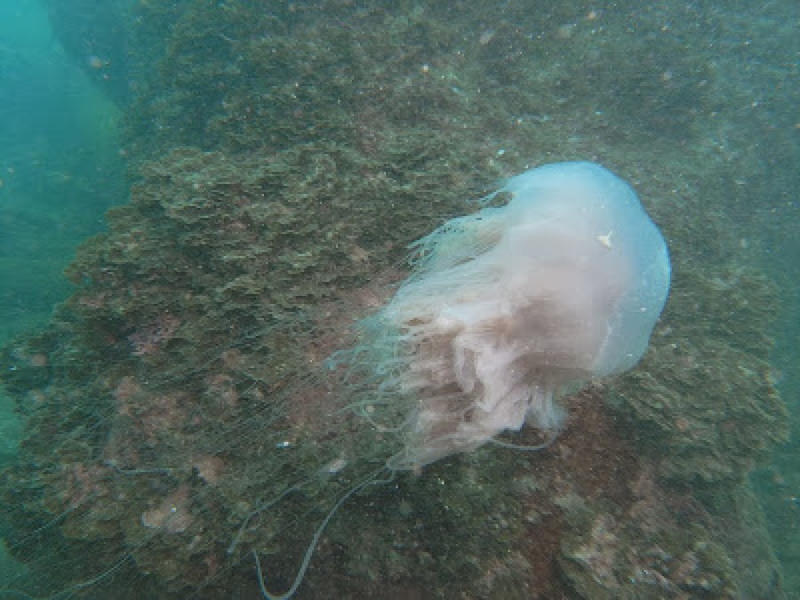 2009年7月26日野柳岸潛看到這隻水母, 有長長的鬚, 在那裡一縮一縮的, 很大隻很可愛, 讓我印象深刻, 直到2011年中才知道, 這是Phacellophora camtschatica, 俗稱煎蛋水母fried egg jellyfish。