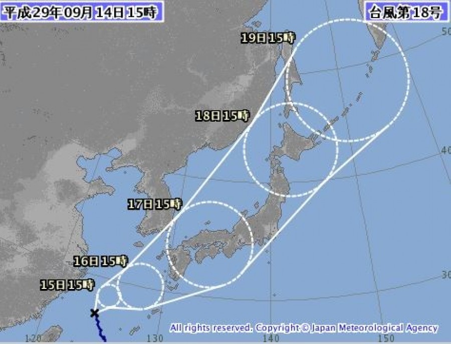 日本氣象廳預測,泰利颱風最快於星期日上午逼近九州,可能會穿越關西地區於下週一襲向東京。(圖擷取自日本氣象廳)