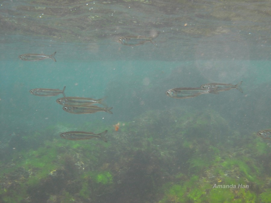 在白天的近岸淺水區的表層,出現一群速度中等快的魚,立即藉自然光拍下他們的倩影。