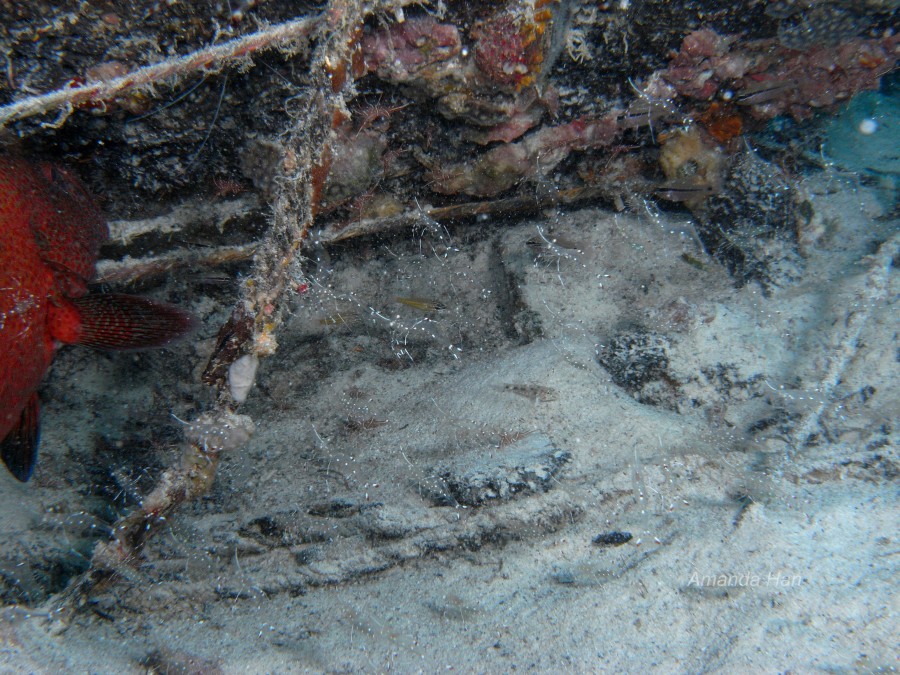 照片中好多透明有白點的蝦子就是清潔蝦,長臂蝦科瘦尾蝦屬 Urocaridella sp. 他們正在幫宋氏九刺鮨 Cephalopholis sonnerati (Valenciennes, 1828) 進行清潔工作。