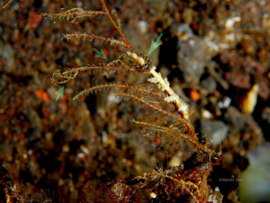 第二張照片中的箭頭處可看到呈站立姿式的深色麥桿蟲站在海蛞蝓 Kaibero phasmida 上方,似乎在「威嚇」著這隻海蛞蝓,同樣地,多處水螅分枝上,亦可看到很多小隻、身體呈黃色的麥稈蟲。