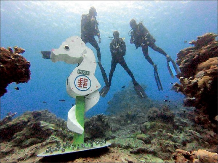 台東縣政府與中華郵政合作,在綠島石朗浮潛區外海水下十一.五米沙地,設置不鏽鋼製作的豆丁海馬郵筒,昨天正式啟用。海底郵筒高度一八○公分,比原本金氏世界紀錄認定最深、海下十米的日本和歌山海底郵筒還深。
