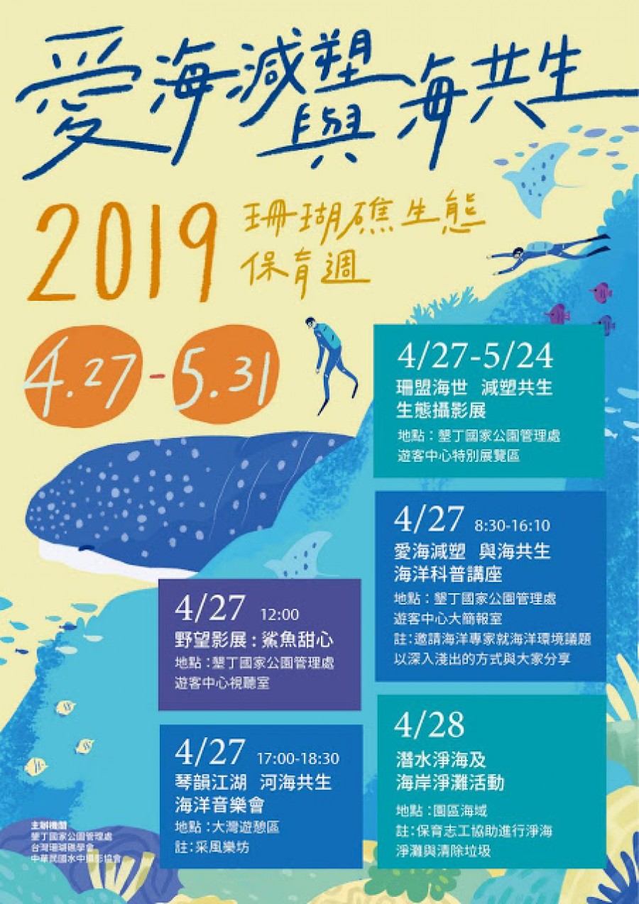 每年在珊瑚產卵的季節時,墾丁國家公園管理處、中華民國水中攝影協會及台灣珊瑚礁學會都會辦理一系列珊瑚保育活動,今年(2019)除了「愛海減塑 與海共生」海洋科普講座、「琴韻江湖 河海共生」海洋音樂會、以及淨海淨灘清除垃圾的愛海活動外,還特別舉辦一場「珊盟海世 減塑共生」生態攝影展。