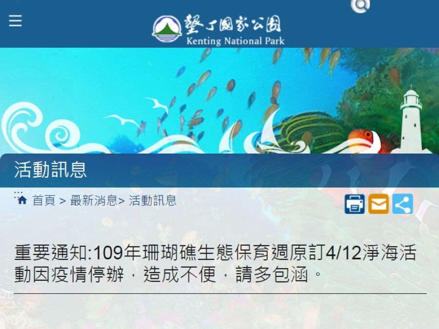 今天(109年3月31日)墾丁國家公園管理處決定,為考量活動會聚集人流與人潮,因此,原訂今年4月12日墾丁淨海活動停辦,明年視疫情再議。 墾管處官網已經發出緊急公告