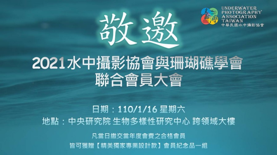 2021本會與珊瑚礁學會聯合會員大會將於110/1/16星期六,假中央研究院生物多樣性研究中心跨領域大樓舉行(台北市南港區研究院路二段128號)。當日協會也會召開理監事會與會員大會,請各位踴躍報名參加。